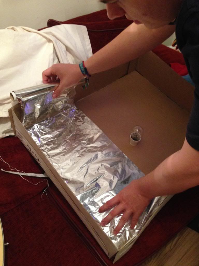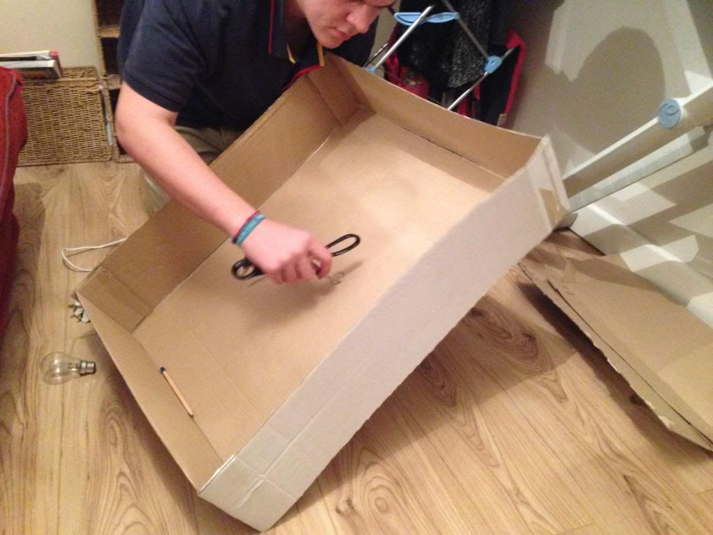 Forming a small, lidless box out of larger sheets of cardboard, I began the softbox. I then measured the circumference of the clamp light so that it could be mounted in the box' back.