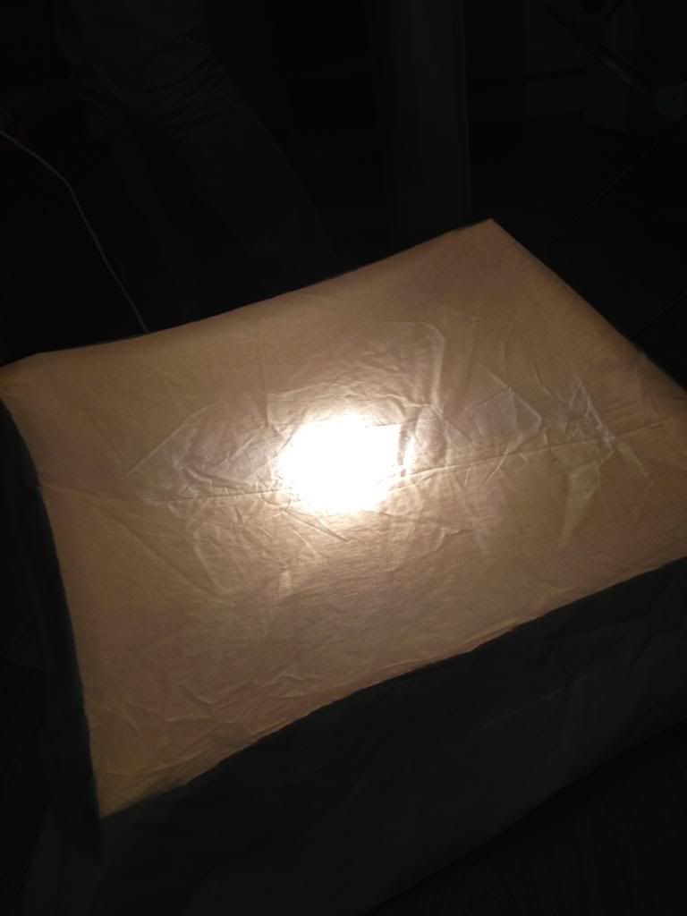 With this lining, the light spreads much better and it can even be used without the sheet as a powerful 'flood' light should my setting be dark enough for it. This is a very cheap, but effective way of achieving a well lit scene and it should help a lot for production. As the light bulb is a tungsten, indoor bulb I may have to alter the white balance on my camera for the scenes I involve this in - especially if it will be the main source of light for the shots.